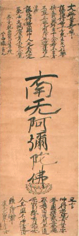 La première est la plus répandue aujourd'hui. C'est la formule canonique du nembutsu : Na.mo A.mi.da butsu. Tirée du Sûtra des contemplations de Vie-Infinie, elle peut se traduire par "Révérence au Buddha Amida". On la désigne comme le "Vénérable Nom en six caractères" (rokuji-songô), et elle constitue une transcription phonétique du sanskrit en caractères chinois. - Le Honganji conserve des calligraphies du Nom en six caractères par Shinran et par les patriarches, dont le 8e Rennyo, le 9e Jitsunyo et le 10e Shônyo.