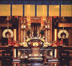 Dans le sanctuaire (naijijn), le "palais" central abrite la statue en bois du Buddha Amida, Vénéré principal (Go-honzon) du Shinshû.