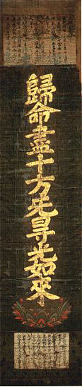 La première est la plus répandue aujourd'hui. C'est la formule canonique du nembutsu : Na.mo A.mi.da butsu. Tirée du Sûtra des contemplations de Vie-Infinie, elle peut se traduire par "Révérence au Buddha Amida". On la désigne comme le "Vénérable Nom en six caractères" (rokuji-songô), et elle constitue une transcription phonétique du sanskrit en caractères chinois. - Le Honganji conserve des calligraphies du Nom en six caractères par Shinran et par les patriarches, dont le 8e Rennyo, le 9e Jitsunyo et le 10e Shônyo.